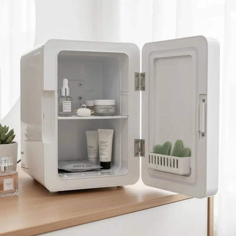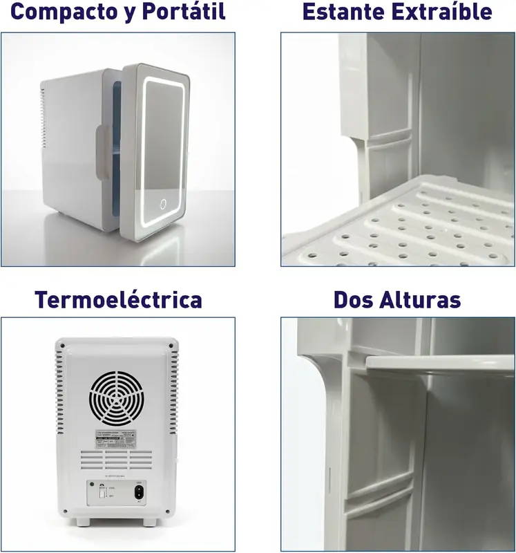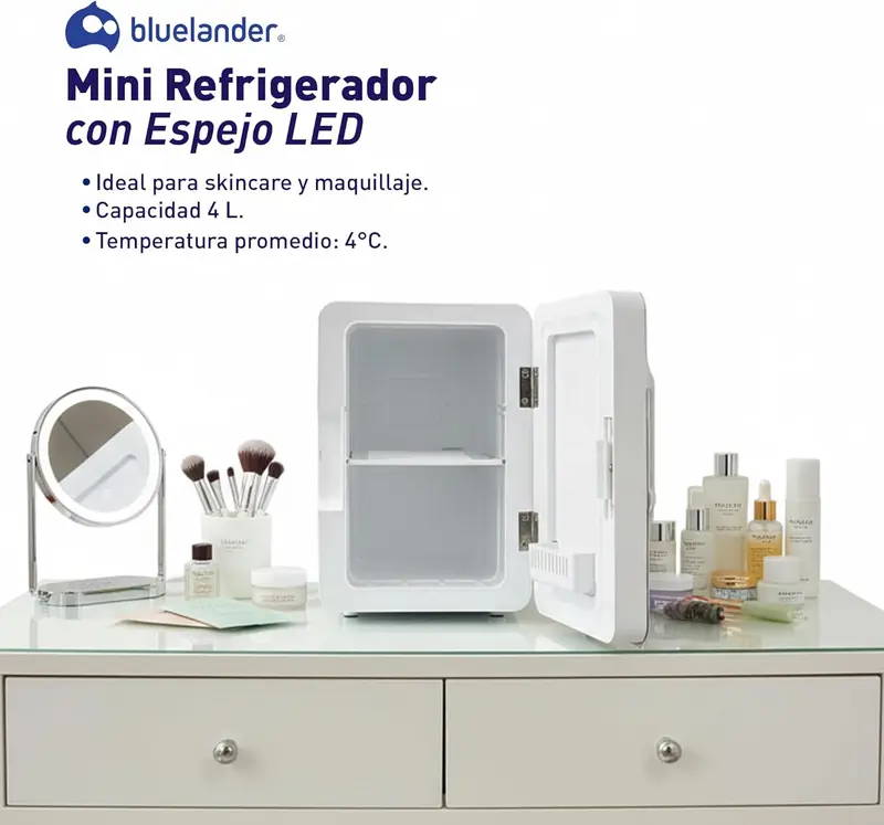 “Mini refrigerador muy práctico y elegante.Mantiene los productos de skincare a buena temperatura y el espejo con luz LED es un gran plus. Ideal para oficina, recámara o tocador. Cumple perfectamente su función.”