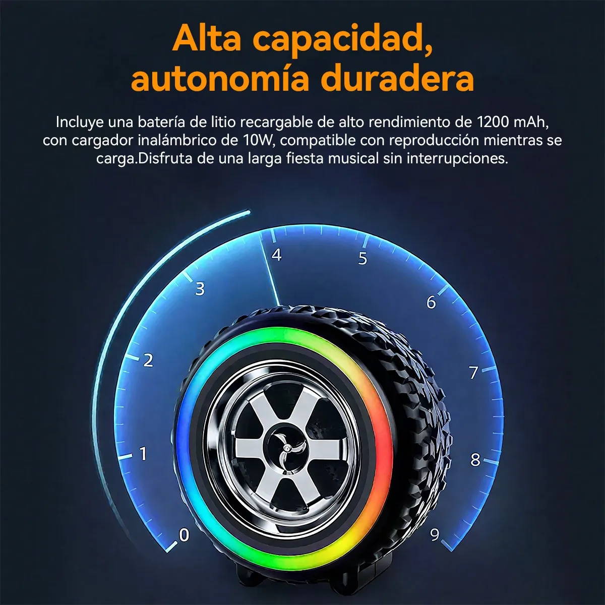 “Muy buen parlante. El diseño en forma de llanta con luces LED le da un toque moderno y divertido, y la calidad de sonido es sorprendentemente buena para su tamaño. Se conecta rápido por Bluetooth y funciona perfecto para ambientar cualquier espacio.”